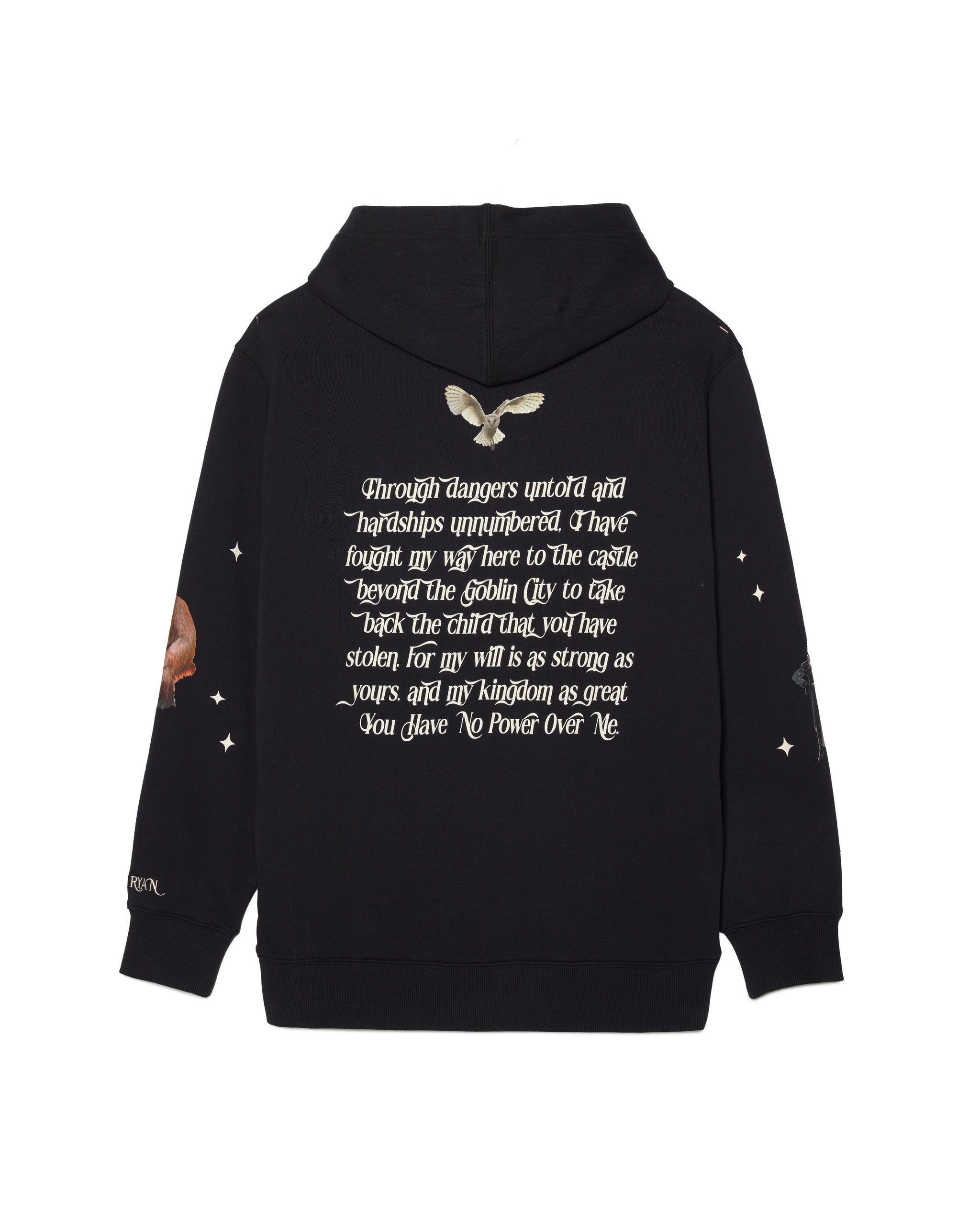 The You Have No Power Over Me Hoodie captures one of the most iconic moments from Jim Henson’s Labyrinth. Designed in soft French terry with a relaxed fit, this piece features a cinematic front print of Sarah holding her book and the film’s title in metallic gold. The back showcases her powerful quote in storybook lettering, surrounded by stars and subtle character graphics along the sleeves. A statement hoodie for dreamers, believers, and anyone finding their way through the maze.