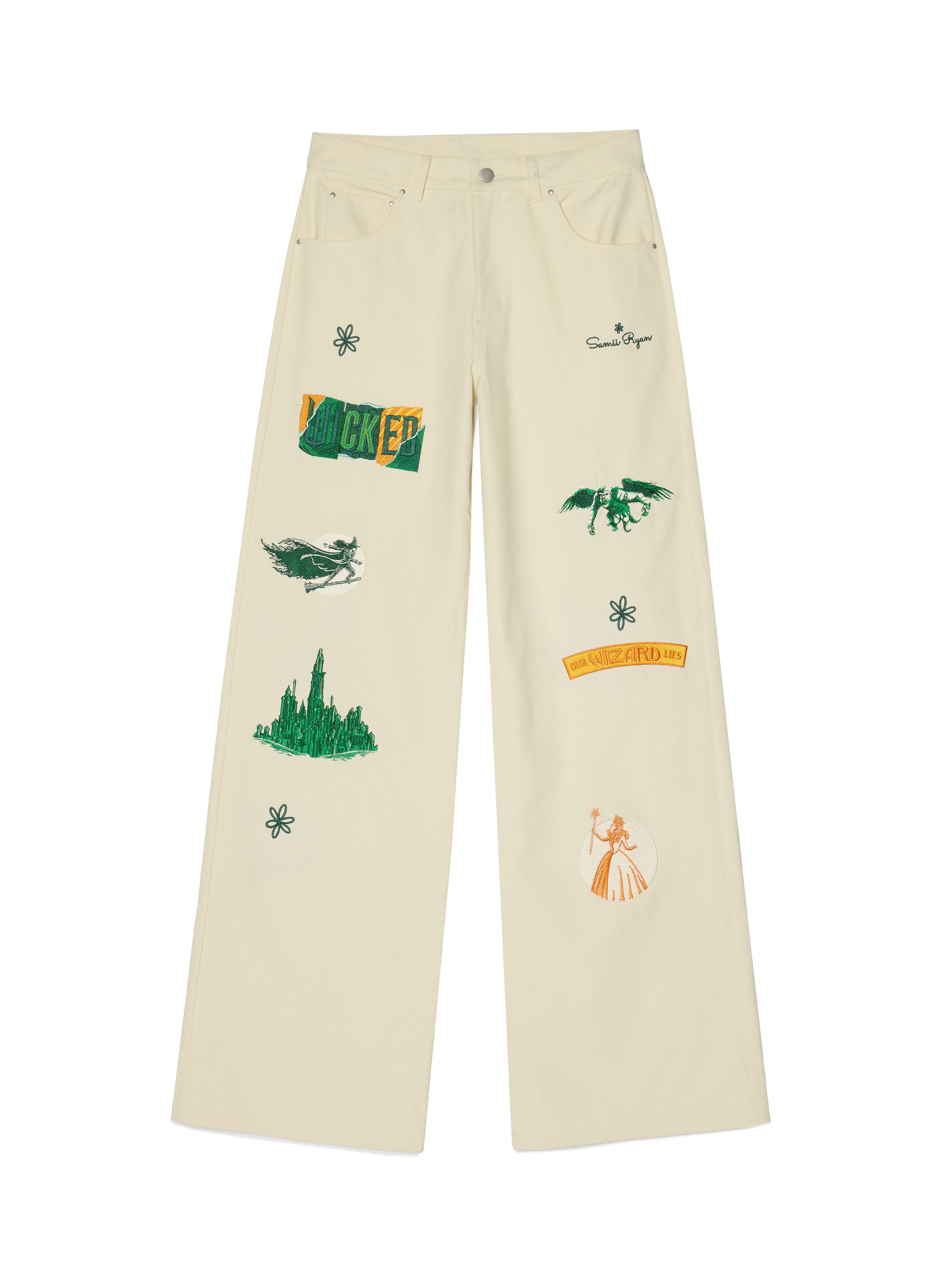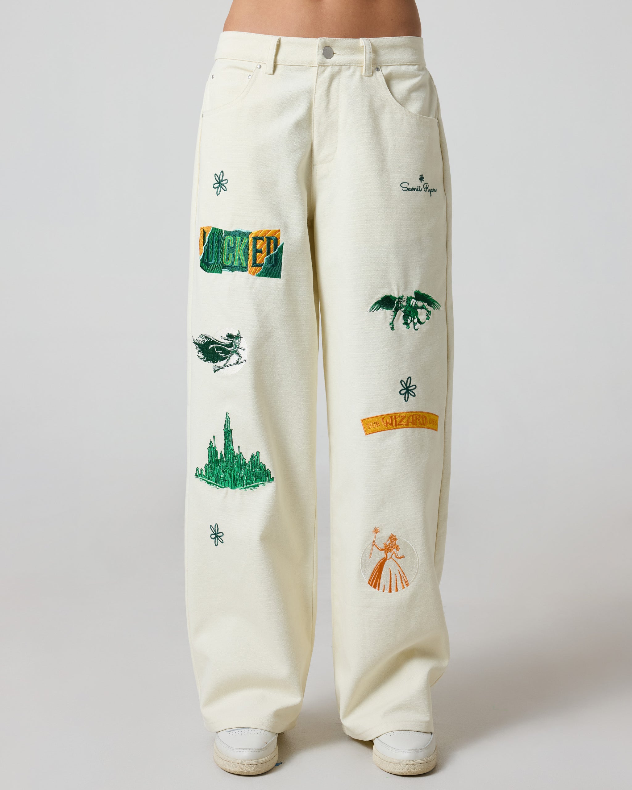 Bring the magic of Oz into your everyday wardrobe with these heavyweight canvas pants. Featuring detailed embroidery of Wicked: For Good's most iconic symbols, from the Emerald City to Glinda and Elphaba, these relaxed-fit pants are a true collectible piece. Designed for both comfort and statement making style, they’re perfect for fans who want to wear their Wicked: For Good pride.