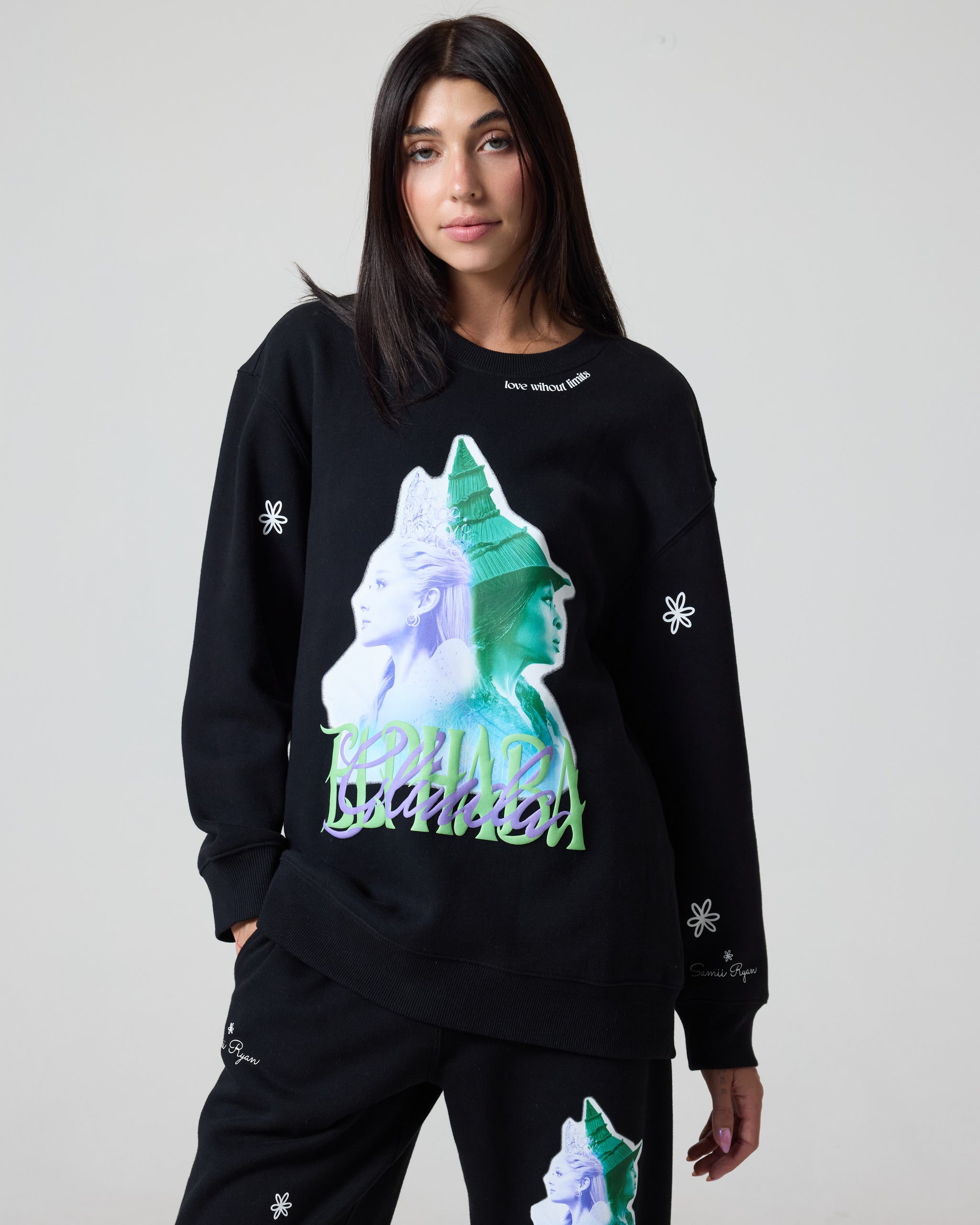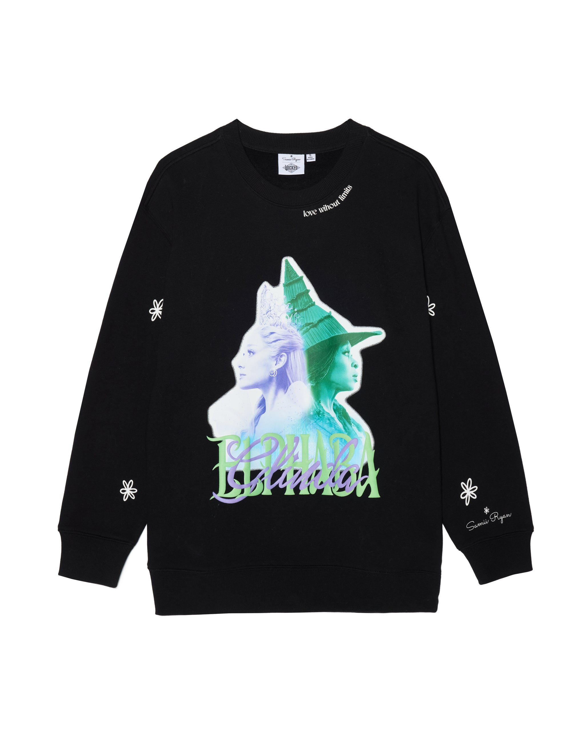 Love knows no bounds. This bold crewneck features a graphic of Elphaba and Glinda side by side, reminding us that friendship and love can defy every limit. "Love without limits" printed on the collar with delicate daisies on the sleeves.