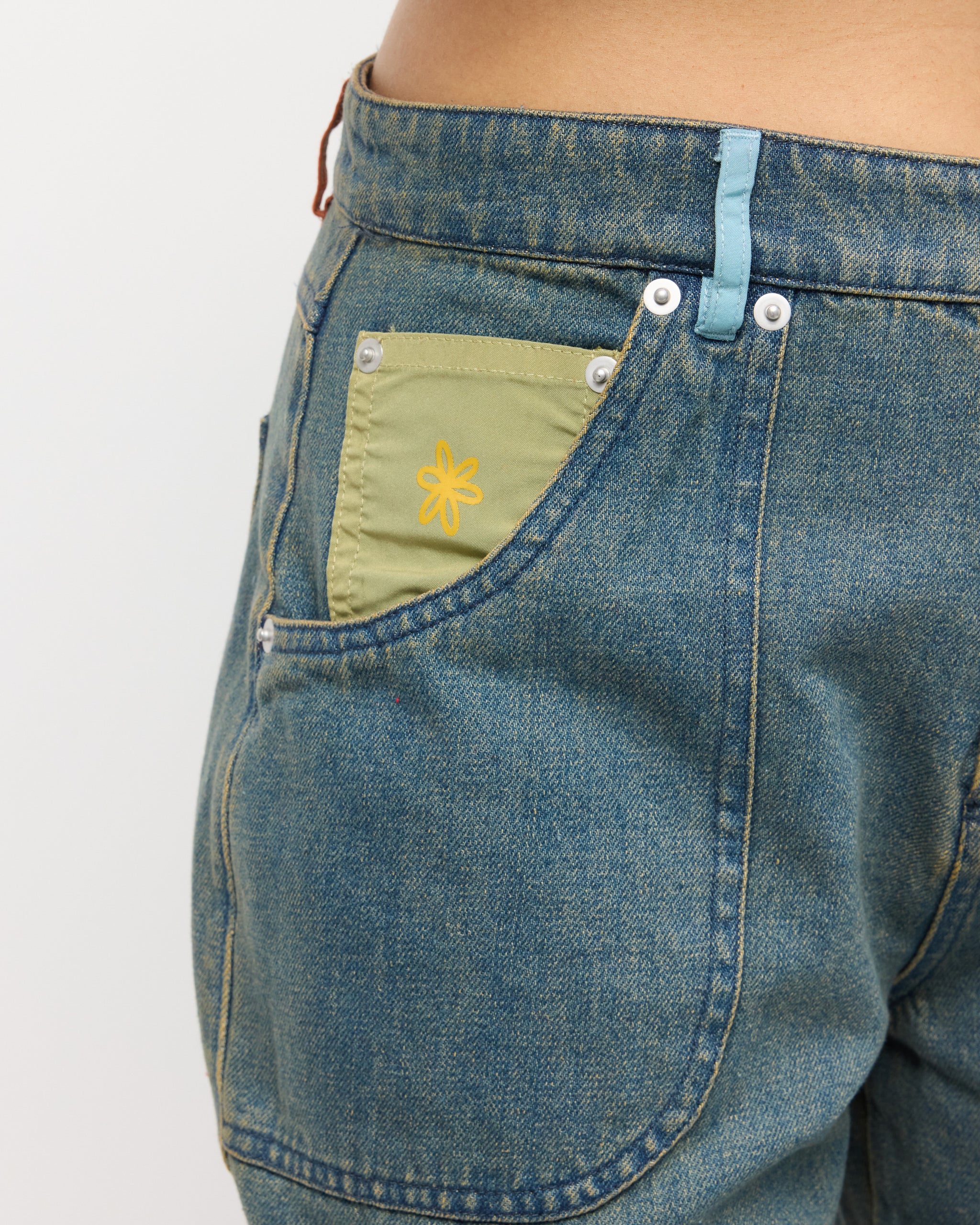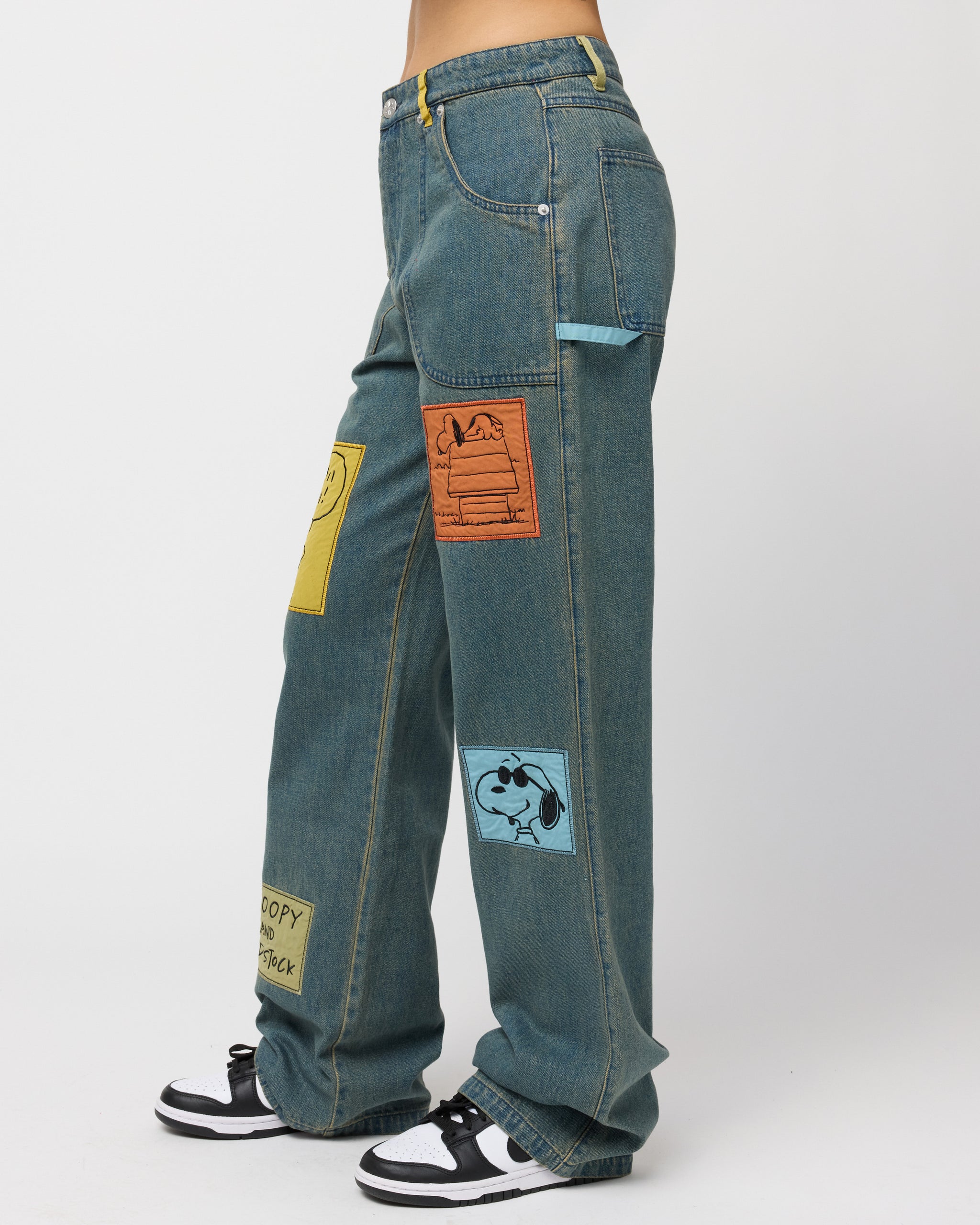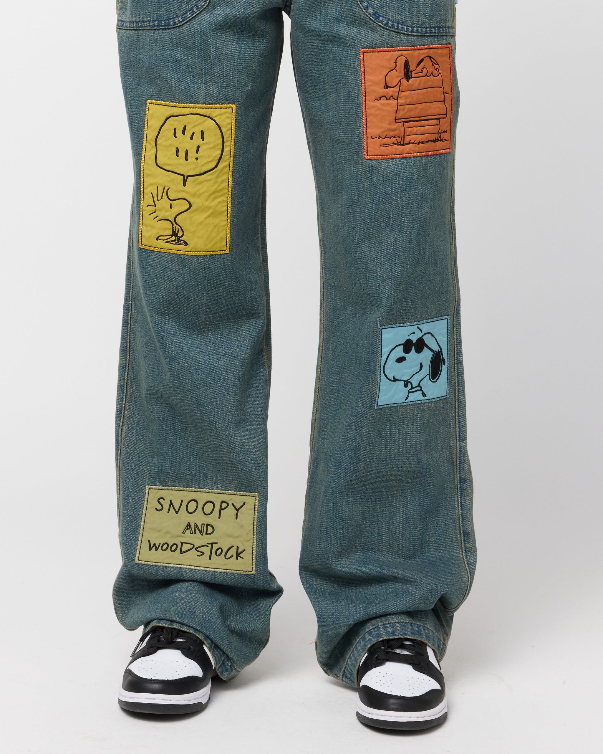 A denim love letter to Snoopy & Woodstock. These pants feature colorful appliqué patches of the iconic duo, bringing a handcrafted, nostalgic feel to a relaxed straight-leg silhouette. The medium-wash denim makes them easy to style, while the artwork makes them impossible to forget.