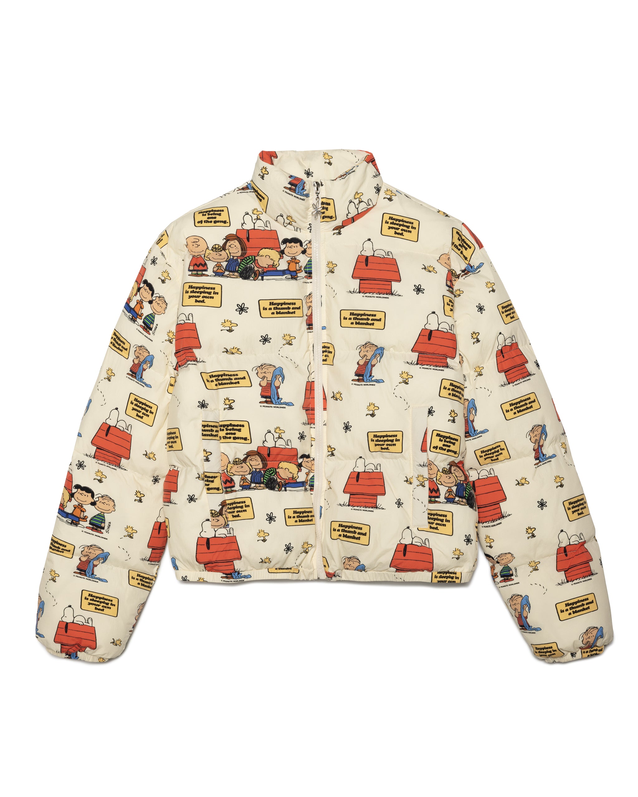 Wrap yourself in nostalgia. This bubble jacket features an all-over “Meaning of Happiness” Peanuts print showcasing Snoopy, Woodstock, and the entire crew in their most heartwarming moments. With puffy quilting, cozy warmth, and a personality packed design, it’s the statement winter layer that turns comfort into pure joy.