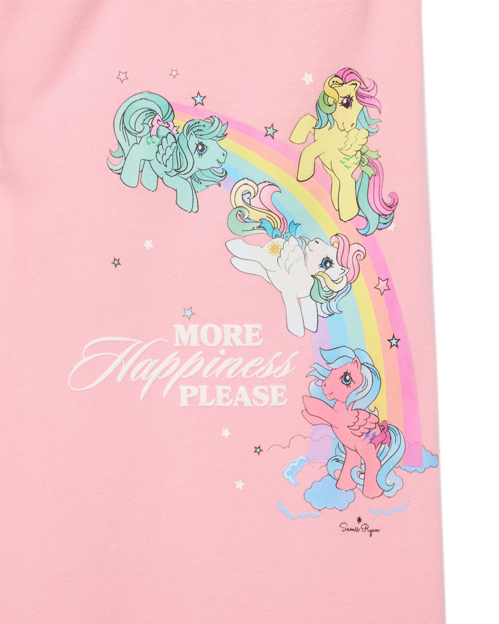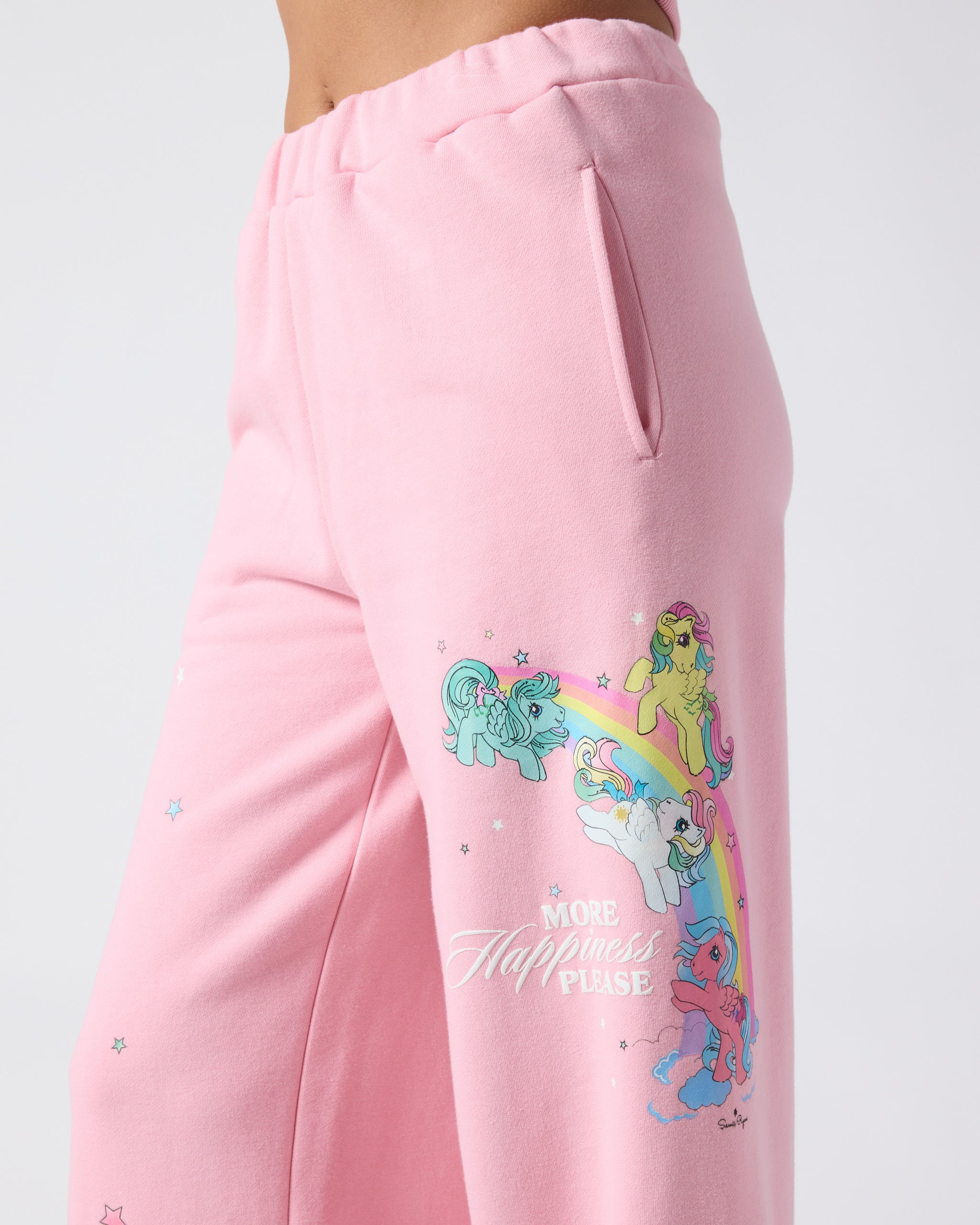 A soft pink sweatpant designed to bring a little extra joy into your everyday routine. Featuring iconic My Little Pony® characters floating along a pastel rainbow with playful star details throughout, this pair blends nostalgic charm with cozy, lounge-ready comfort. Easy, relaxed, and made to mix and match with your favorite pieces from the collection.