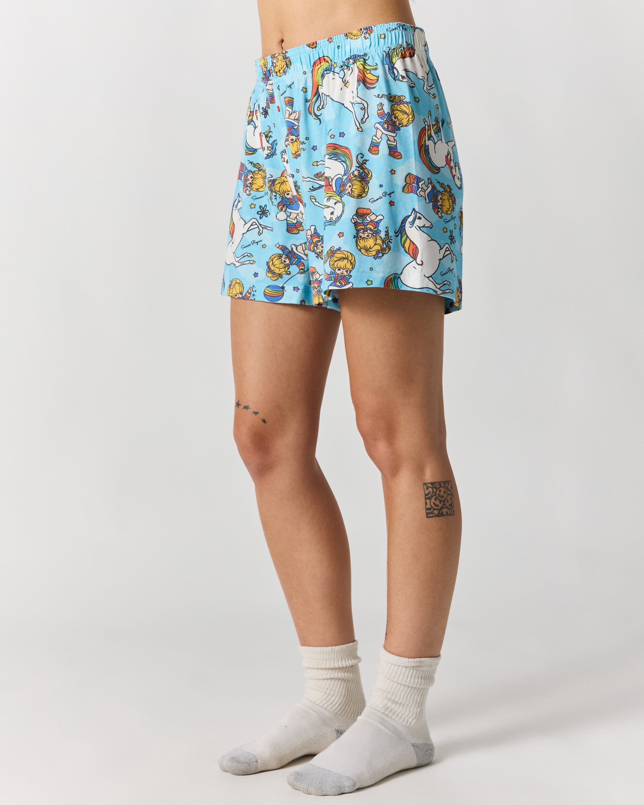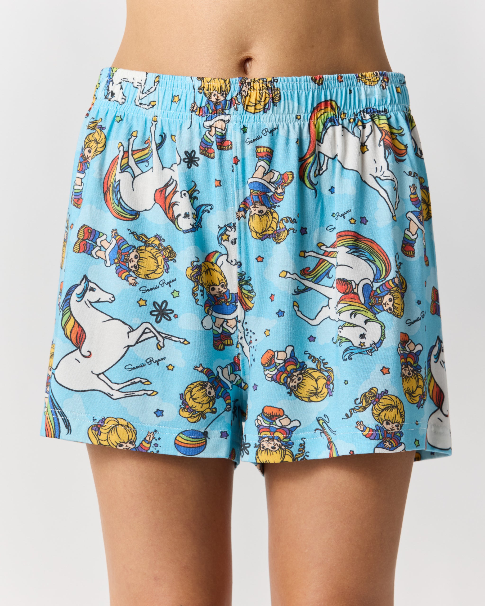 Dreamy, colorful, and unbelievably soft. The Slumber Stars Pajama Shorts feature an all over Rainbow Brite print on a snuggly, lightweight fabric made for cozy nights and slow mornings. With a relaxed fit and stretchy waistband, they are the perfect match to the pajama top.